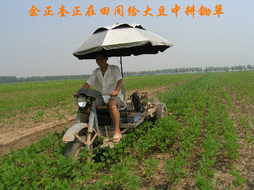 7月30日上午,在明光市潘村湖農場五分場一塊大田里,一輛撐著遮陽傘的小型三輪車正在豆行間不緊不慢地行駛著。原來,這是該場職工余正奎正在給大豆中耕鋤草。