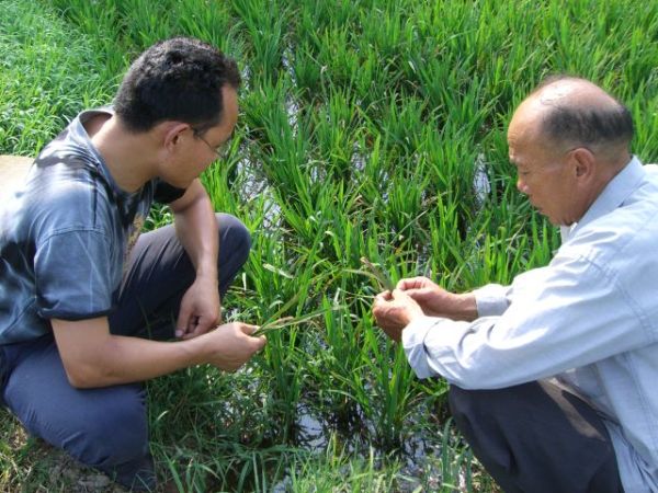 8月3日,筆者見到程大強是在安徽省農墾皖河農場楊樹分場的田頭,只見他挽著褲腿,皮涼鞋上沾滿了泥漿,一副眼鏡似乎少了一條腿橫在鼻梁上。其時他正在向農戶講解稻縱卷葉螟的防治方法。