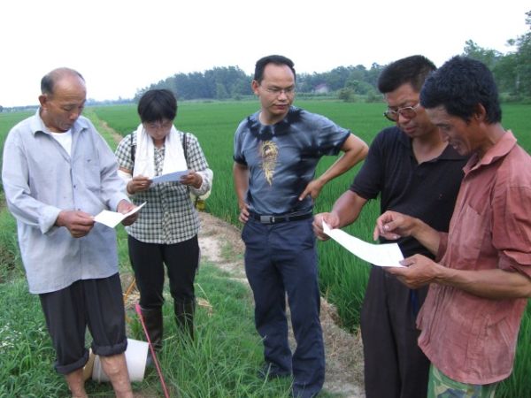 7月25日對于植保站的年輕人來說是最繁忙的一天,上午8點,程大強專門從安慶市請來植保專家向農戶面授機宜,指導稻縱卷葉螟的防治秘訣。當天野外溫度達到40℃,中午1點30分左右,仍有不少農戶拽著程大強們不松手,拉著他們到稻田里察看蟲情。下午4點左右,他又接到來自楊樹分場種糧大戶李澤光的求援電話,于是,程大強又開著摩托車一溜煙趕到外李澤光的田里“診斷”病蟲害,當即為他開出了藥方,并叮囑他按時、按劑量配藥和噴施。直到天黑,程大強才一身風塵的趕回家中。