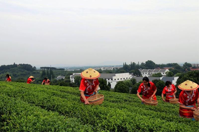 緊鄰敬亭山茶場場部的鳳凰山,是皖墾茶業集團的名牌產品“敬亭綠雪”的主要產地之一。這里的茶園與丘陵地形完美融合,秀美的林木點綴在成片的茶園中間,高低錯落,精美別致。細心的主辦方在半山腰的空地上搭起了一座涼棚,供活動嘉賓品茶觀景,茶場職工在這一天也穿上了鮮艷的具有民族風情的服裝來采茶。采風間歇,活動嘉賓來到涼棚里休息,熱情的農場職工已為大家沏好了茶,在敬亭綠雪的產地喝著正宗的敬亭綠雪,別有一番風味。