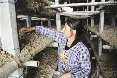 朱堂芝檢查雙孢菇菌絲生長(zhǎng)情況