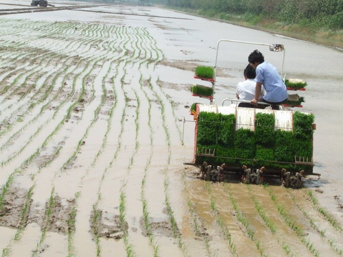 方邱湖農(nóng)場種子公司大面積推廣機(jī)插秧走過了育秧、整地階段,今天正式開始插秧。上午,在有關(guān)技術(shù)人員的指導(dǎo)下,新購置的乘坐式“洋馬”插秧機(jī)輕盈地飄行在秧田里,身后留下了一行行蔥綠的秧苗。第一家開始插秧的家庭農(nóng)場職工徐新芳夫婦小心地幫著搬秧運秧,喜悅的心情時不時的從略顯緊張的臉上流露出來。據(jù)現(xiàn)場的技術(shù)人員介紹,如果工作環(huán)節(jié)協(xié)調(diào)好,一臺插秧機(jī)一天可插秧百畝以上,按照這個速度三~四天就可完成全部插秧任務(wù)。(邱緒恒)