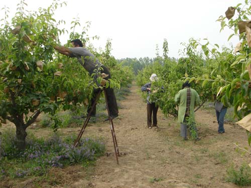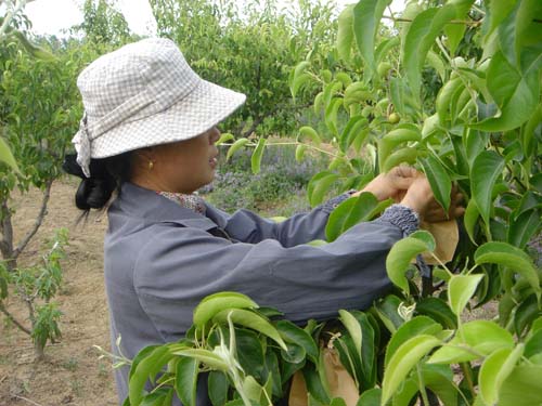 自2002年以來,碭山果園場為適應市場的需求,優化品種結構,大力進行產品結構調整,高接日韓圓黃、黃冠等“洋梨”近2000畝,至2007年已全部進入盛果期。日韓“洋梨”不套袋似“丑小鴨”,又黑又粗;套上袋似“白天鵝”,又白又細。貨賣一張皮,不套袋的“洋梨”出園價約0.8元/公斤,套袋的“洋梨”出園價約2.5元/公斤,價格懸殊很大。2007年,該場發布“洋梨”套袋總動員,并提供技術指導服務,聯系套袋,職工積極響應,踴躍套袋。至5月23日,全場已套袋梨園面積1800畝,使用套袋720萬只,可生產優質“洋梨”400多萬斤,幫助職工增收上百萬元,有力地促進了我場現代農業的發展。