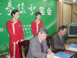 筆會的座談會上,文藝家們在品嘗名茗——敬亭綠 雪的同時,觀看了安徽農業大學茶藝表演隊“中華 茶藝——敬亭綠雪茶藝”表演,聽取了茶葉專家有 關敬亭綠雪歷史、傳統工藝的恢復、敬亭綠雪的品 質和市場定位的介紹,接著文藝家與茶葉專家,就 中華茶文化的歷史淵源,敬亭綠雪的品牌戰略、市 場運作、產品的質量保障、產品的市場定位、產品 的規格和包裝、開拓國際市場等方面進行了深入的 探討,文藝家們提出了許多很好的建議。文藝家認 為這次文化與經濟聯手,名人與名茶結合,舉辦筆 會,是一項大膽的創新和成功的策劃,是有遠見的 企業家的正確決策,將對樹立安徽農墾的企業形 象,打造“敬亭綠雪”品牌具有長期的重要意義。 在會場文藝家們,感受到安徽綠茶的品質,尤其是 茶中珍品——敬亭綠雪“色純如玉、品靜似天”香 醇,使他們靈感大發,當場呤詩作賦,揮毫潑墨, 給安徽農墾留下了寶貴的精神財富,陶冶了農場職 工的情操,提升了“敬亭綠雪”的文化底蘊,豐富 了農墾安徽農墾集團,必將極大地鼓舞安徽農墾人在全 面建設小康社會的偉大征程中意氣風發、滿懷豪情 地開創農墾事業發展的新局面。
