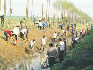 連日來,為加強小麥田間管理、做好清溝瀝水工作,東 風湖農場集中人力,對有關主排灌大溝進行清淤。圖為 機關、場直單位及三分場職工清淤現場。