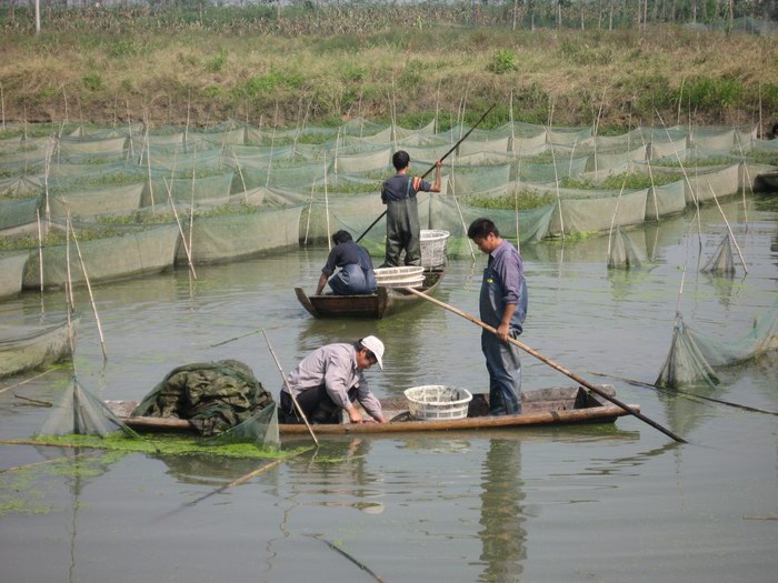 秋日的陽光映照在一格格綠色網箱上,網箱內的綠草被依次扒開,身著皮衣、皮靴的五六個捕撈者分成三組,劃著三只小船從箱內格子里撈取黃鱔,一簍一簍地運到岸上。