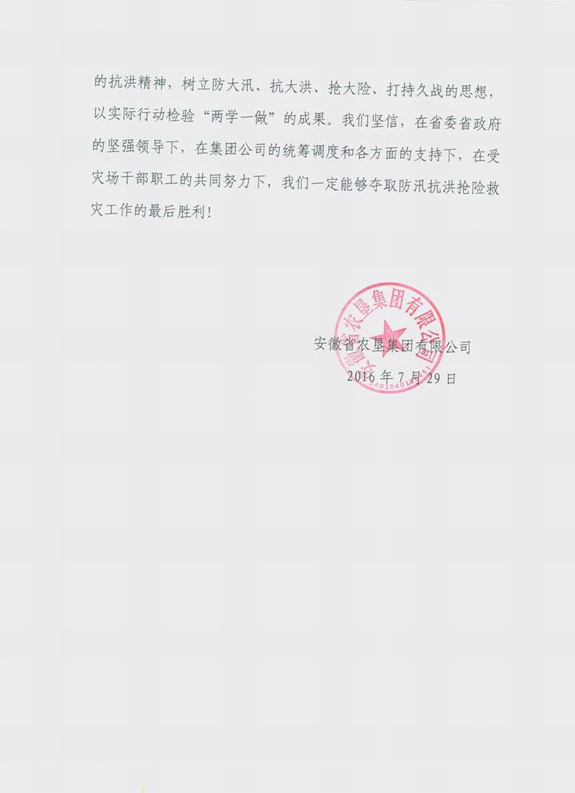 安徽農墾集團致信慰問抗洪一線干群