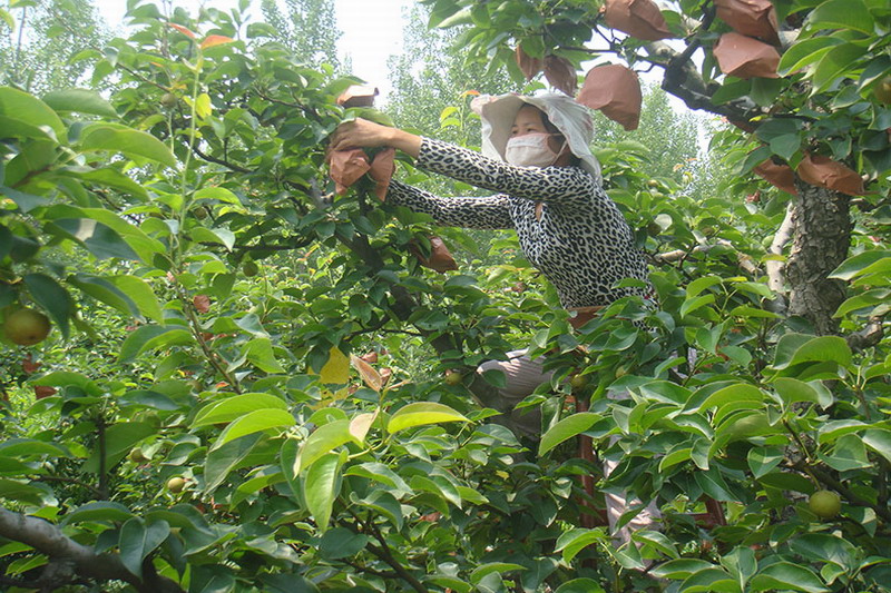 碭山果園場尚有中晚熟梨園近3000畝,品種主要是黃冠、圓黃、運達一號等,果實套袋既可改善果面顏色,亦能提升果品品質(zhì)。今年該場梨園座果率偏高,目前職工一邊進行疏果,一邊加緊套袋,套袋工作于近日收尾。