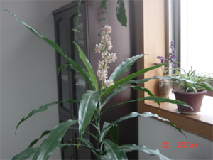 從網(wǎng)上一查,原來:巴西木,原產(chǎn)國巴西,是我國 引入栽培的一種著名橡膠樹,喜暖熱氣候,適合在 濕潤的沃土里生長,不易開花,在北方地區(qū)開花尤 其罕見。