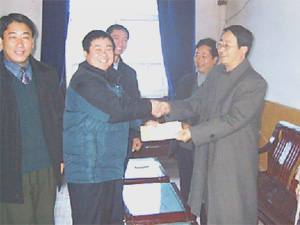 (圖為:涂玉龍場長代表特困職工接受集團(tuán)公司的 捐贈(zèng))
