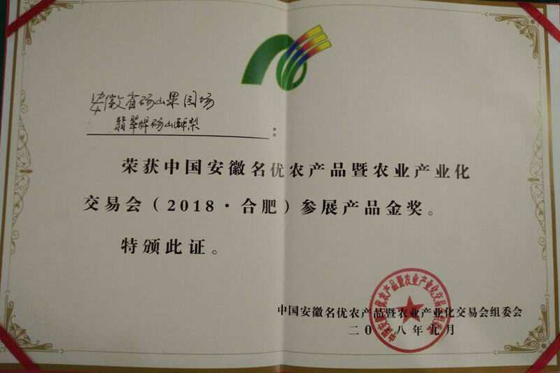 9月15-17日,2018中國安徽名優農產品暨農業產業化交易會在合肥舉行。安徽農墾碭山果園場翡翠牌酥梨奪得農交會參展產品金獎。