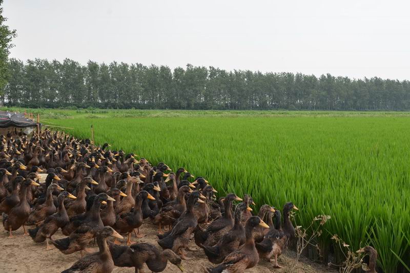 稻鴨共生是一種節本增效的綠色生態農業模式。安徽農墾大壙圩農場2013年開始在有機稻基地進行稻田養鴨試點,初試大獲成功,當年效益頗豐。稻鴨混養今年已在農場150多畝有機稻田得到全面推廣。