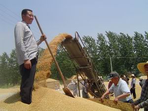 龍亢農場實行統一供優質品種、農技措施服務、田 間管理到位,全場小麥喜獲好收成,平均畝產達4 40公斤。(圖為家庭農場小麥豐收喜悅場面) 黨群部:王戴群
