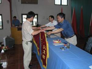 潘村湖農(nóng)場(chǎng)紀(jì)念中國(guó)共產(chǎn)黨成立83周年大會(huì)于7月1 日上午在場(chǎng)部職工之家禮堂隆重召開(kāi)。來(lái)自全場(chǎng)各 黨支部的400余名黨員參加了會(huì)議。場(chǎng)黨委書(shū)記、場(chǎng) 長(zhǎng)韓大鳴作了重要講話。副場(chǎng)長(zhǎng)殷文格宣布了今年 上半年吸收為中共預(yù)備黨員同志的名單。7名新黨員 在鮮紅的黨旗面前莊嚴(yán)宣誓,與會(huì)全體同志同時(shí)重 溫了入黨誓詞。副場(chǎng)長(zhǎng)陶衛(wèi)東宣讀了《關(guān)于表彰 2003年度先進(jìn)黨支部、先進(jìn)黨小組和優(yōu)秀黨員的決 定》。會(huì)上舉行了簡(jiǎn)樸熱烈的頒獎(jiǎng)儀式。會(huì)議結(jié)束 前,全體黨員集體收看了黨員電教影片。場(chǎng)黨委副 書(shū)記、紀(jì)委書(shū)記林賢傳主持了大會(huì)。圖為場(chǎng)黨委書(shū) 記韓大鳴、副書(shū)記林賢傳向獲得先進(jìn)黨支部稱(chēng)號(hào)的 單位頒發(fā)錦旗。(楊登宏)