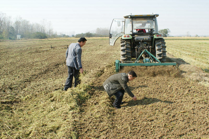 114,安徽大壙圩農場調集10多輛收割、運輸等機械,在天長市大通鎮統一流轉田里搶收成熟的水稻,大馬力拖拉機隨即對秸稈粉碎全量還田的稻茬田進行滅茬旋耕作業,農場流轉田秋收秋種工作同步有序展開。