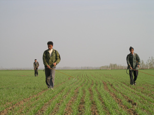 由于近期氣溫較高,麥田麥圓蜘蛛等害蟲有爆發態 勢。針對這一情況,連日來,潘村湖農場廣大家庭 農場職工積極開展防治工作。圖為二分場職工正在 田間噴藥治蟲。(楊登宏攝)