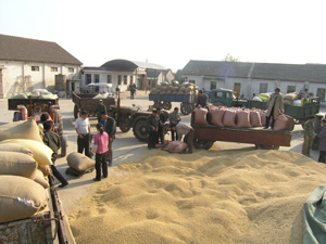 說明:潘村湖農場今年秋季大豆喜獲豐收,產量水 平創建場50年來最高。廣大農工豐收不忘集體,踴 躍繳納秋糧。到11月19日,全場已完成計劃任務的 92%%。其中二分場、六分場在全場率先完成了產品上 繳任務。圖為職工交糧場景。(楊登宏攝)