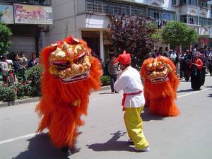 5月6日,龍亢農(nóng)場(chǎng)夕陽(yáng)紅藝術(shù)團(tuán)組織一支40多人組成 的表演隊(duì),參加安徽省懷遠(yuǎn)縣第十四屆花鼓燈藝術(shù)節(jié) 的踩街活動(dòng),受到沿街?jǐn)?shù)萬(wàn)名觀(guān)眾的贊揚(yáng).圖為藝術(shù) 團(tuán)在表演獅子。(王戴群)