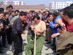 圖片說明:為慶祝“五一”、“五四”節(jié)日的到 來,連日來,龍亢農場工會組織開展拔河、自行車 慢騎、羽毛球、卡拉OK、演講等,全場近千名職工 群眾參與活動,豐富了職工業(yè)余文化生活。圖為男 子拔河比賽。(王戴群)