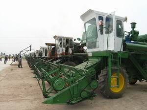 為迎接即將到來的"三夏"戰役,潘村湖農場于5月27 日在全場范圍內開展了一次農機和安全生產檢查活 動.圖為四分場收割機手早早將自家的收割機整齊有 序地停放在曬場,接受場安委會的檢查。