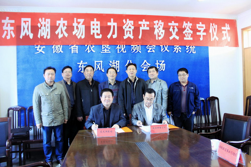 劉超在講話時對雙方正式簽約表示熱烈祝賀。他說,東風湖農場電力資產正式移交是安徽農墾歷時十年的電力體制移交工作的重大突破,意義重大,來之不易,這是鳳臺供電公司顧全大局、支持農場、強力推進的結果,也是東風湖農場領導重視、措施得力的結果,在全墾區率先取得了突破。劉超要求,東風湖農場要借好這一東風,按照協議要求狠抓落實,墾區各場要向東風湖農場學習,加強領導,加強溝通,加大力度,加快進程,全面推進電力資產移交工作,早日完成省政府賦予我們的這項歷史性任務。(李傳云)