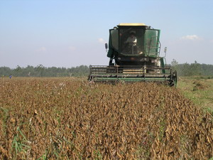 10月8日上午,艷陽高照,秋色正濃.在潘村湖廣褒的 原野上,機械轟鳴,車來車往,2005年秋收會戰全面 打響了.在三分場8號地北,3臺大型聯合收割機來回 穿梭,已經熟透的大豆隨著收割機的傳送裝置一路 歡唱著奔向機倉.不到半天時間,這一塊大田就基本 收割一空.曬場上,一車車金燦燦的大豆運來了,婦 女們麻利地卸糧攤曬,大伙邊勞動邊拉呱,十分熱 鬧.分場領導分片負責,檢查作業質量,維持收割秩 序,協調收割和運輸機械,時時提醒職工不忘安全生 產.8日一天,全場投入收運機械近300臺,到下午5 時,收獲大豆7190畝,加之前期收獲部分,已經完成 收割任務的44%%.9日開始,秋收進入高潮階段,全場 僅各型收割機就投入近200臺,汽車、輪式拖拉機等 運輸車輛300多輛,各家庭農場除老弱病幼外悉數 上陣,全力以赴戰秋收。至11下午,全場3.2萬畝全 部收割完畢,圓滿完成了今年秋收任務。