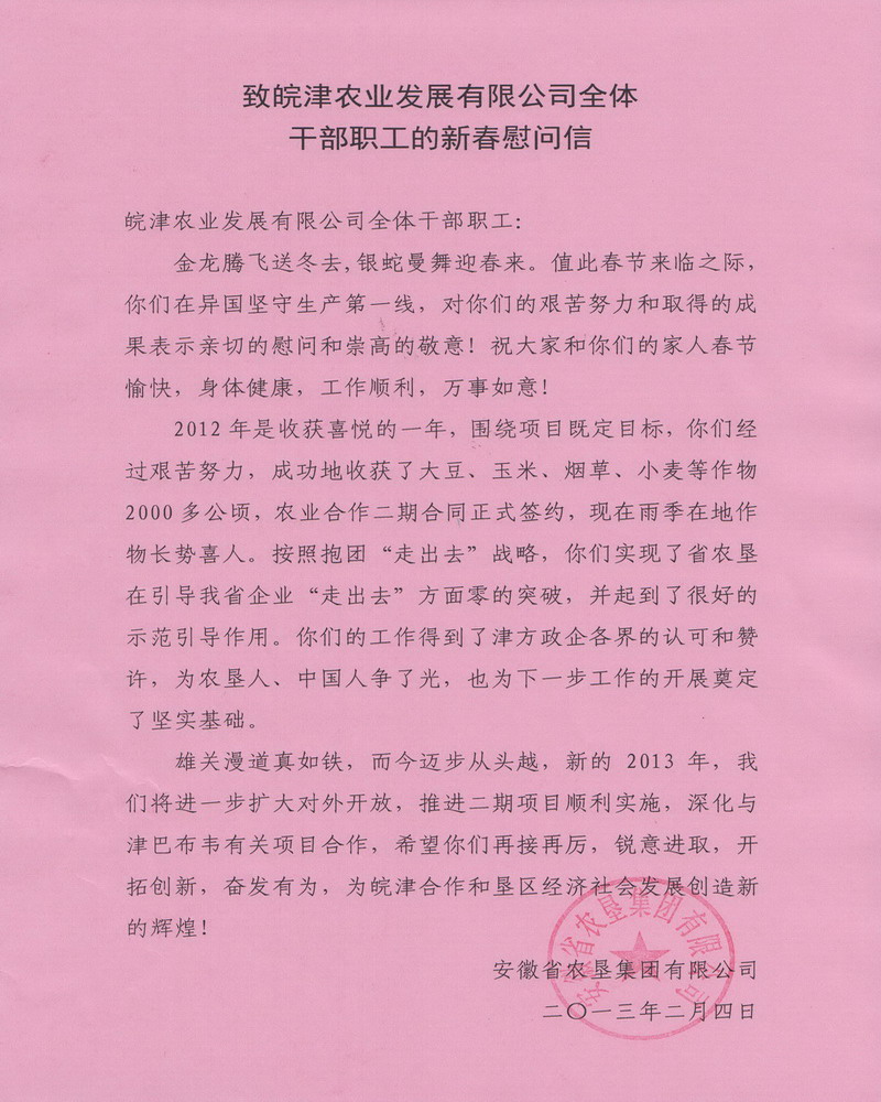安徽農(nóng)墾集團致信慰問皖津公司全體員工
