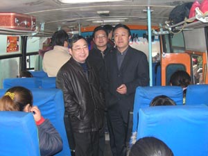 21日一大早,場領導韓大鳴、林賢傳、陶衛東及各 分場領導、機關科室負責同志就來到出發現場為外 出姐妹送行。韓大鳴等場領導還走進車內,與大家 道別,叮囑她們出去后努力工作,發揚我們農墾人 吃苦耐勞、勤勞致富的傳統,在他鄉展示出農場人 良好的精神風貌。通過辛勤勞動,既增加了收入, 也拓寬了視野,學到了新的勞動技能,為今后的發 展創造了有利條件。大家對場領導的親切關懷報以 熱烈掌聲。圖為場領導在車上看望外出務工人員的 情景。(楊登宏攝)