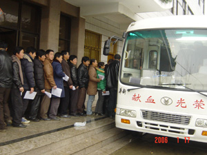 1月17日上午8點鐘,當采血車到達農場后,人們冒 著寒風冷雨,不約而同趕來,獻血的場面感人至 深。在驗血現場,大家踴躍填表,爭相驗血;采驗 車前,長龍般的獻血隊伍從早上排到中午,絡繹不 絕。獻血的人群中有場領導、各單位領導干部、黨 員、學校老師、醫院醫護人員、普通職工、群眾, 有的是夫妻、兄弟、姐妹雙雙結伴而來,還有不少 人已是第二次、第三次無償獻血……。據統計,這 次全場共有122人參加了獻血活動,共獻血24400毫 升。 (夏慶芳)