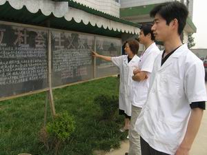 潘村湖農場職工醫院于近日在全院開展了樹立社 會主義榮辱觀教育活動。該院通過召開會議、科室 討論和宣傳欄等形式大力宣傳胡錦濤總書記倡導的 “八榮八恥”,教育全體員工牢固樹立全心全意為 患者服務思想,開展爭先創優競賽活動,取得了良 好效果。圖為醫院工作人員正在宣傳欄前學習討論 社會主義榮辱觀宣傳內容。(楊登宏攝)