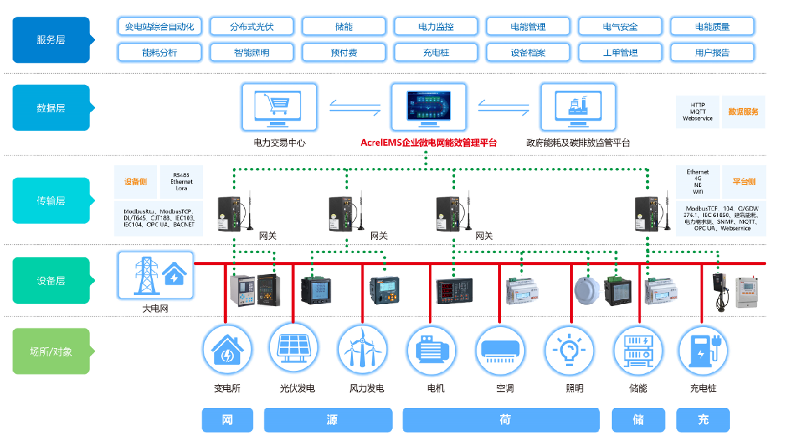 為平臺主界面,針對于企業微電網的源、網、荷、儲、充的各個關鍵節點安裝監測、分析、保護、治理裝置, 通過高性能邊緣計算網關采集數據并上傳至企業微網平臺。平臺根據新的電網價格、用電負荷、電網調度指令等情況, 調整各系統控制策略并遠程下發,使企業微電網始終高效穩定運行,降低企業用電成本,實現能源互聯、信息互動。