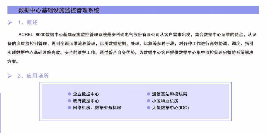 Acrel-8000數據中心基礎設施監控管理系統是安科瑞電氣股份有限公司從客戶需求出發,集合數據中心運營的特點,從設備的底層監控到管理,再到全面運營流程管理,運用數據挖掘、處理、運算等多種手段,對各種工作進行高效協調、調度、指引實現數據中心基礎設施高效、安全的維護工作。通過整合自身優勢,為數據中心客戶提供數據中心集中監控管理完整的